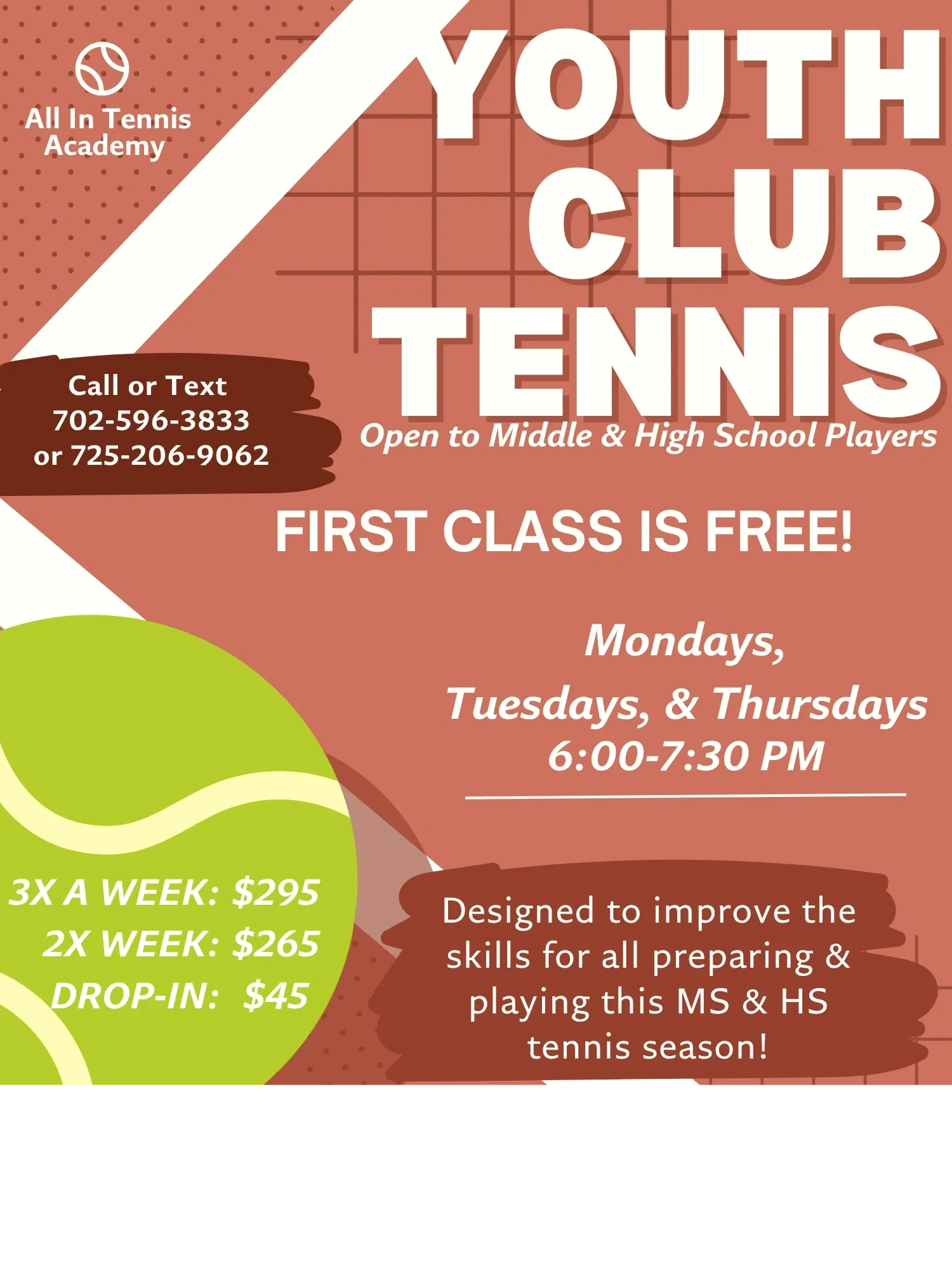 All In Tennis Academy offers variety of junior classes at Spanish Trail Country Club. For More information please contact Iren Schneider at